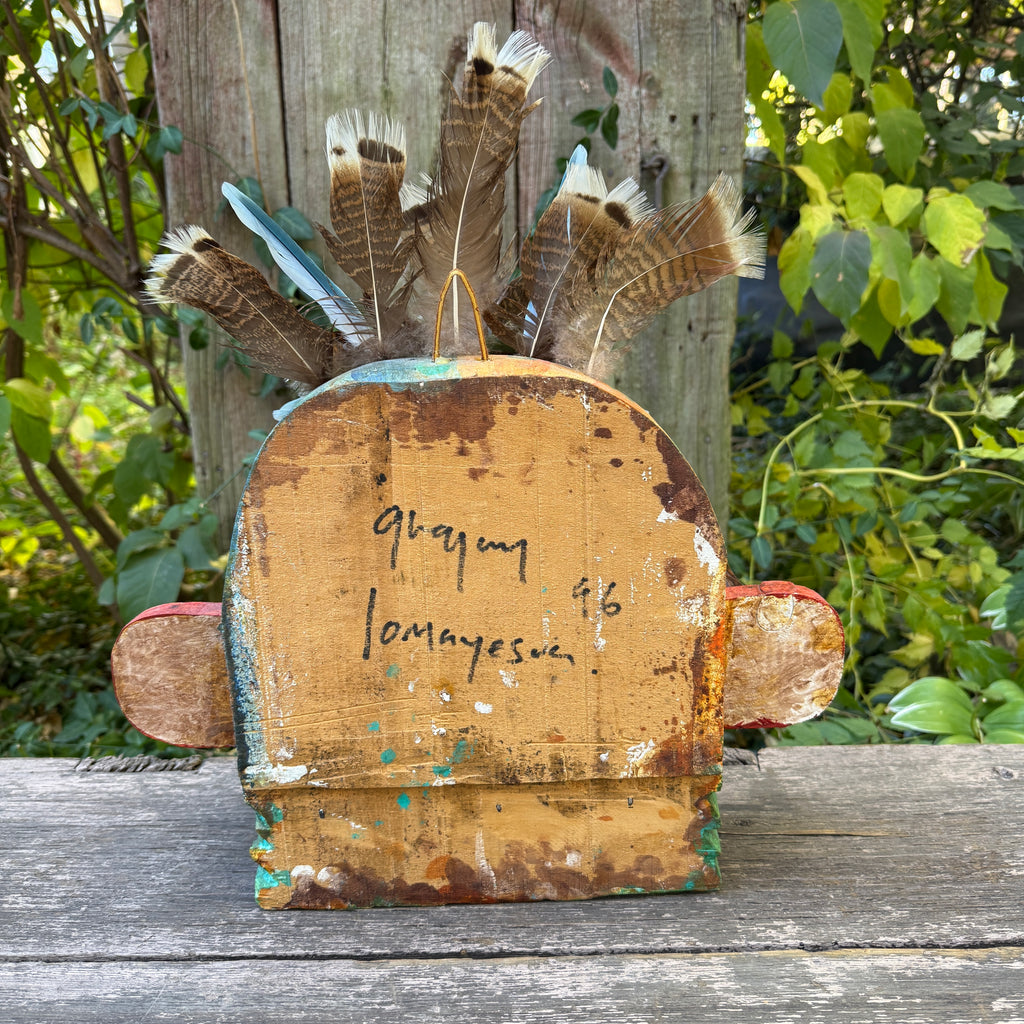 This is a fantastic vintage folk art mask carving with bird feathers by Gregory Lomayesva, Hispanic and Hopi.