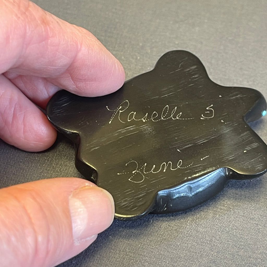 Intricately etched black jet turtle fetish with turquoise eyes and spots.  Signed Raselle S. Zuni.  Vintage.
