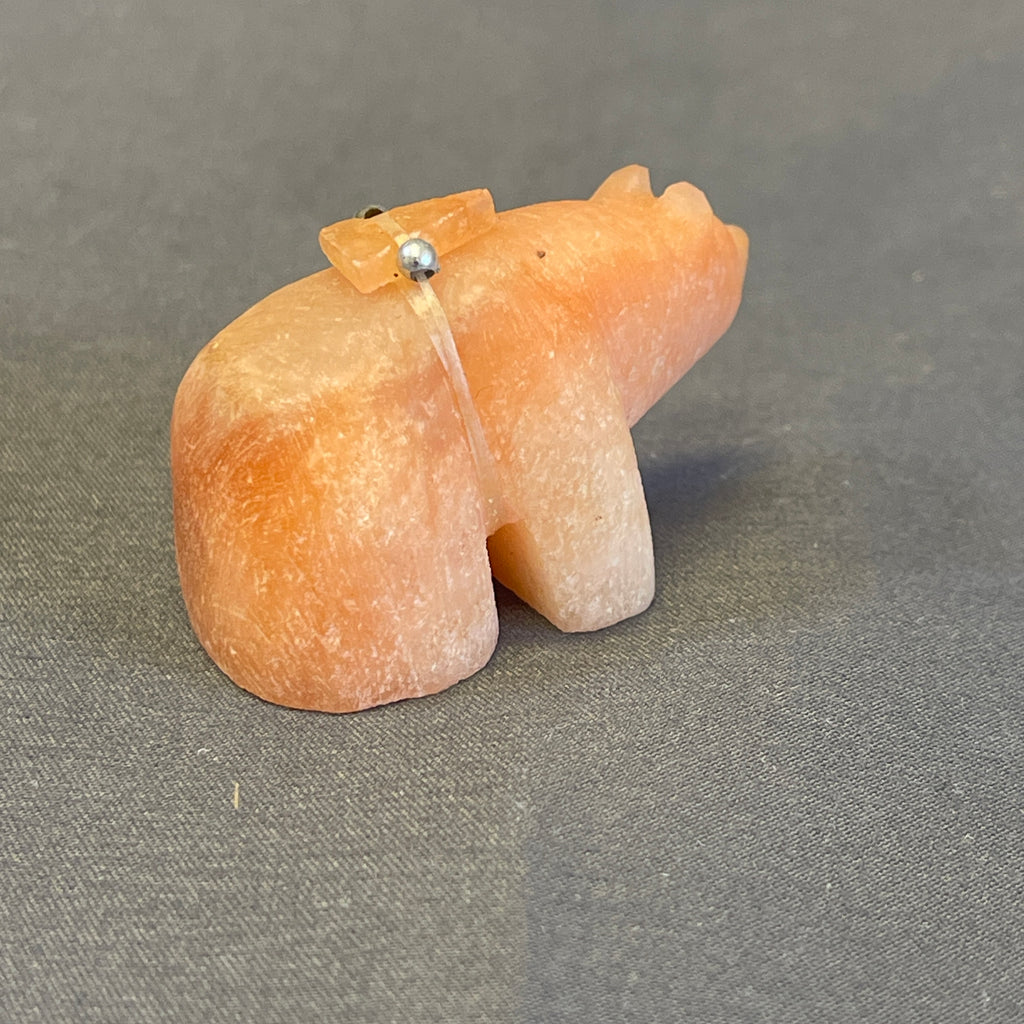 Hand-carved Zuni orange alabaster bear fetish. Bear carries an orange arrow and silver beads gift bundle secured with sinew. Signed TEX. Vintage.
