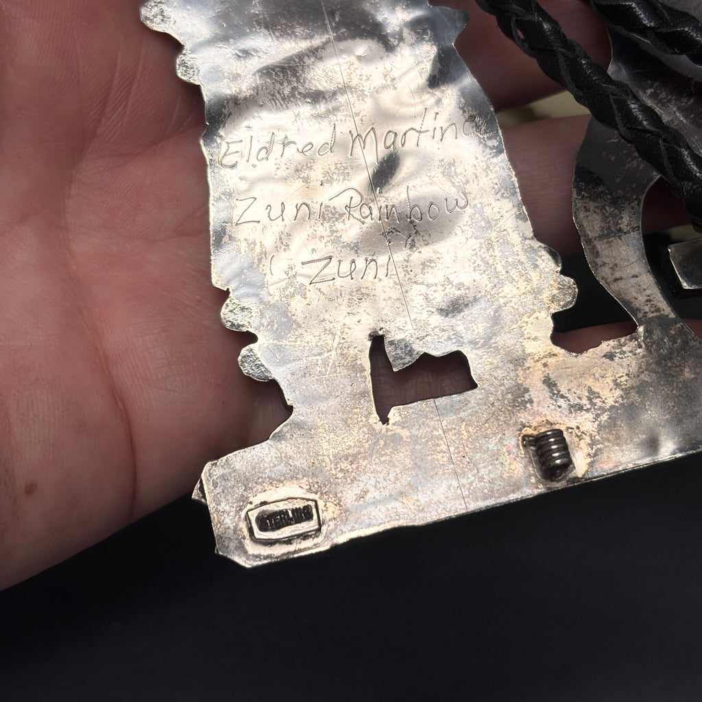 Fantastic Zuni inlay Rainbow Kachina bolo tie and fancy tips signed by noted Zuni artist Eldred Martinez.  The textured inlay design is created with black jet, mother of pearl, red coral, lapis and turquoise stones set into a stamped silver design.  The handwoven black leather strap has textured inlaid lightning dangle tips. Comes with a stone display stand.  Etched signature on the back.