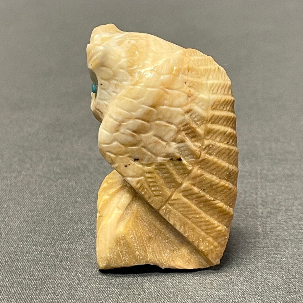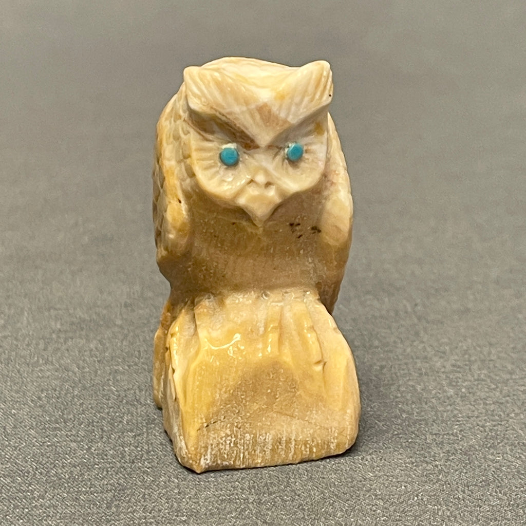 Beautifully detailed owl fetish carved from picasso marble by Zuni artist Derrick Kaamasee. Owl has turquoise eyes and is signed on the bottom.