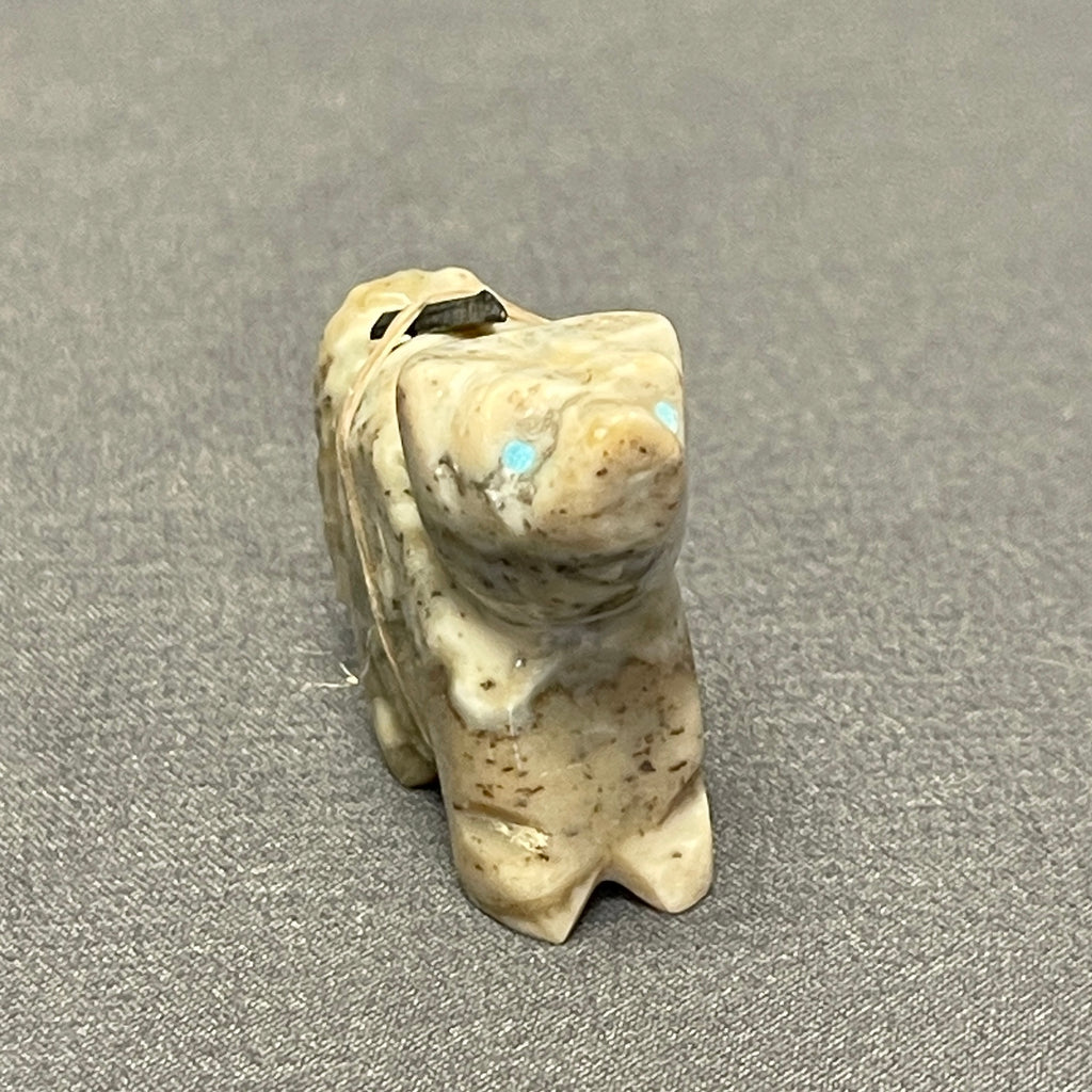 Zuni wolf fetish carved from alabaster. Wolf has turquoise eyes and carries a stone arrow gift bundle attached to its back with sinew. Unsigned.