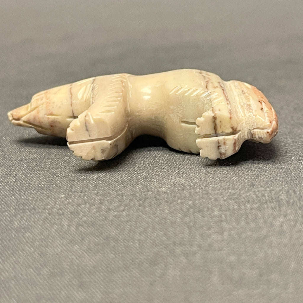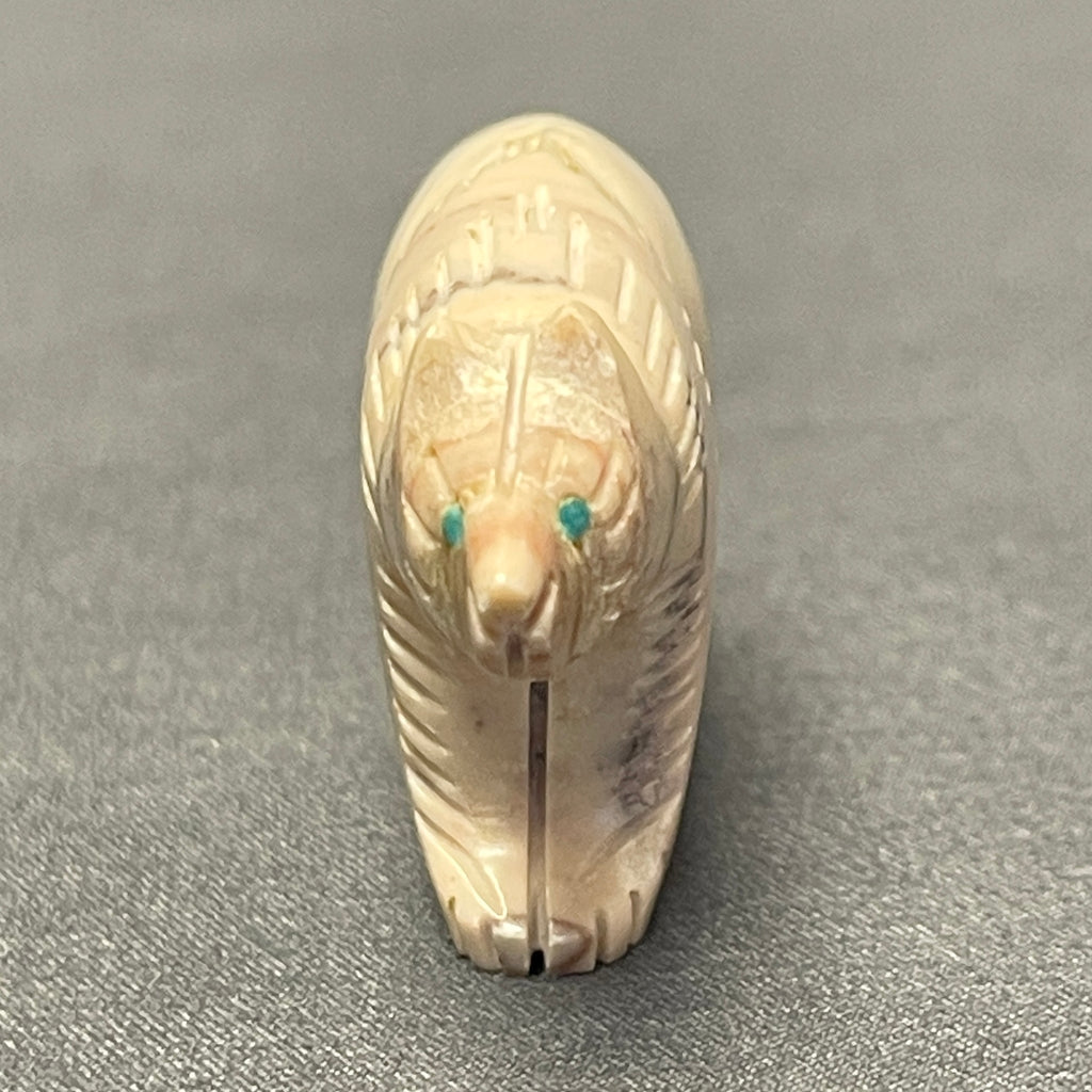 Beautiful Zuni wolf fetish carved from marble with turquoise eyes. Unsigned.