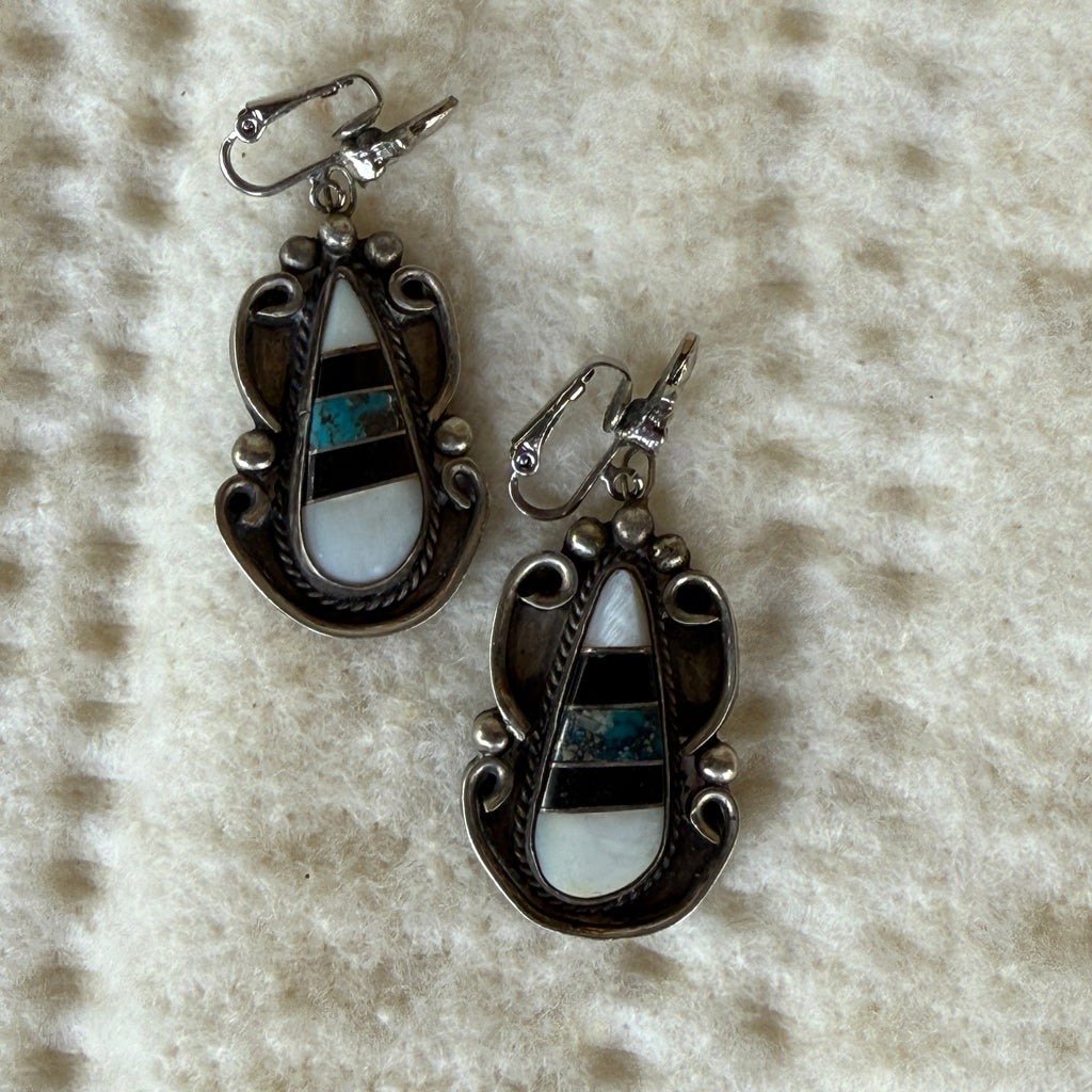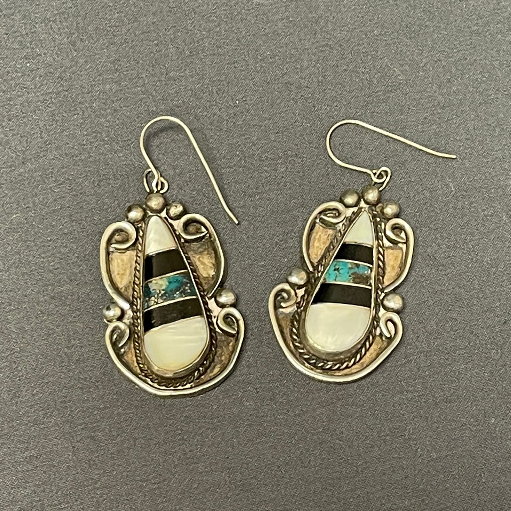 Beautiful and unique Navajo squash blossom necklace SET with multi-stone flush inlay blossoms and naja with matching dangle earrings on hooks. Each blossom has a flush-inlaid center of mother of pearl, turquoise and black jet in a smooth bezel, surrounded by droplets and scrollwork. The open naja showcases 5 pieces of the same inlaid design. There are 10 blossoms strung on handmade sterling silver beads with a hook closure. The matching earrings hang on wire hooks. Both the necklace and earrings are unsigned. Fantastic!