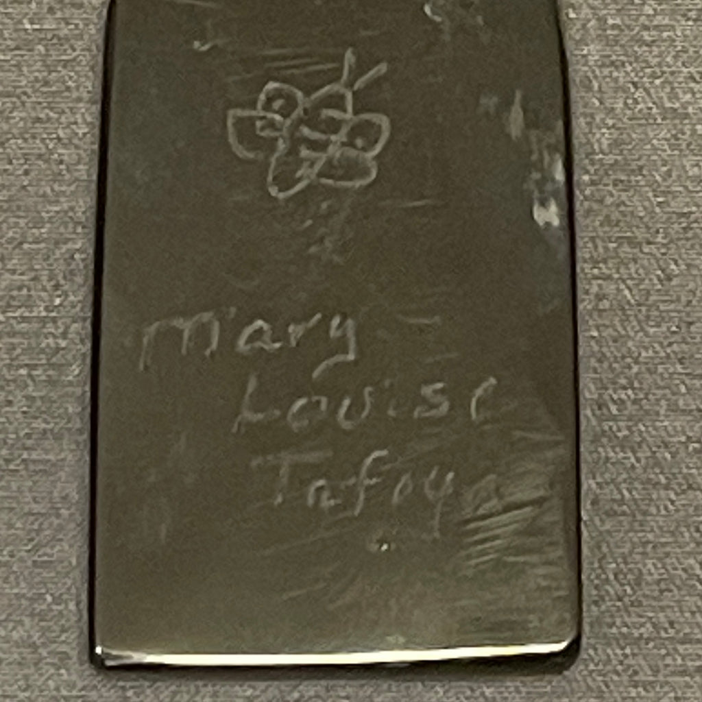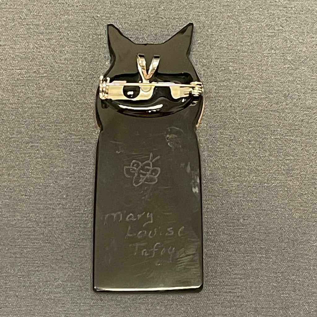 This adorable owl pin/pendant is another beautiful example of Mary Tafoya's work.  Her designs combine turquoise, serpentine, coral and many other stones to make wonderful mosaic designs like this one. Signed Mary Louise Tafoya.