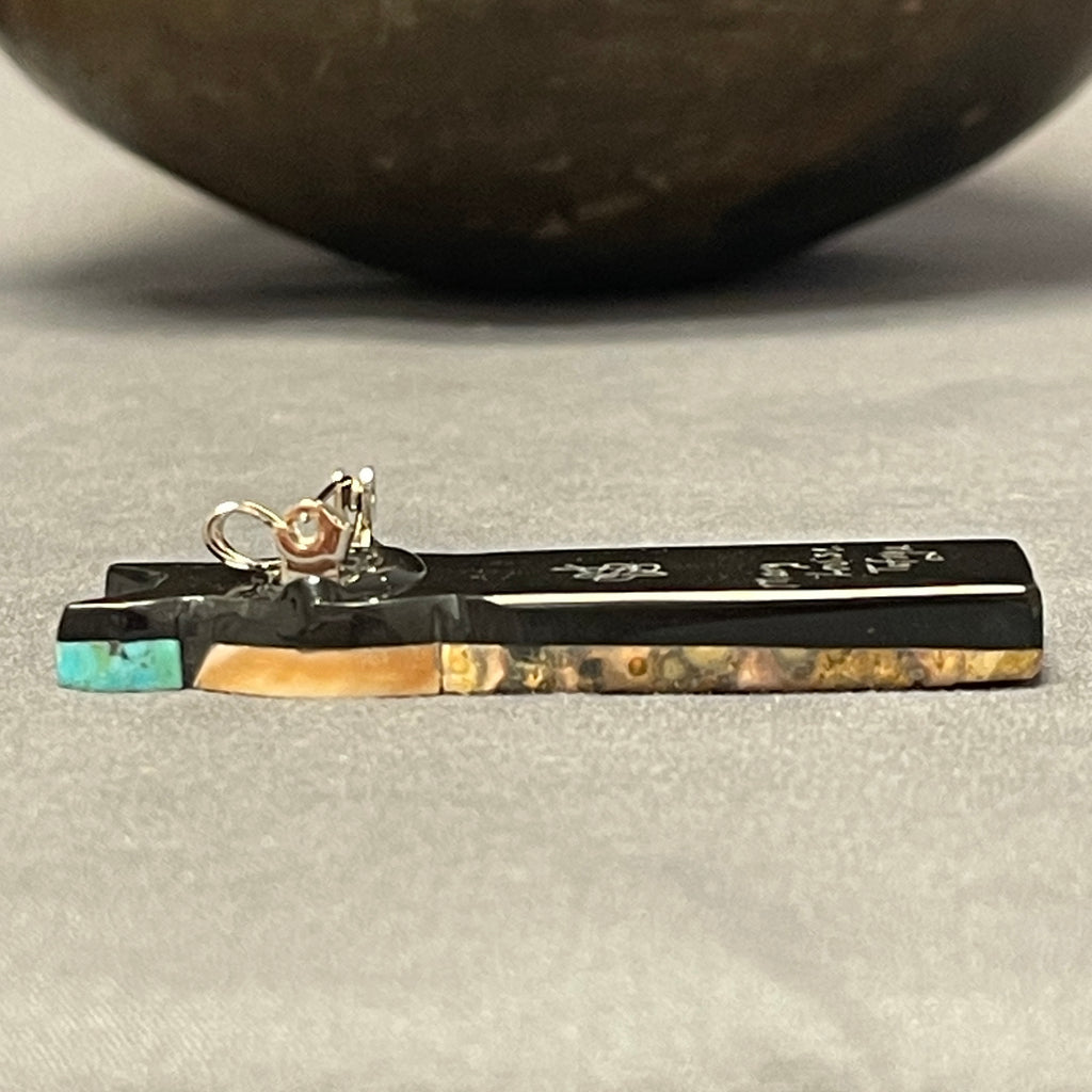 My mother had a huge influence on my style of jewelry-making. I studied as she cut out parts of Thunderbird (pendants) and set them. I would sit for hours and just watch her work. Every now and then I would ask my mother if I could cut out some pieces too. Once she showed me how, I practiced until I became quite good at it. As I continued watching and learning from my parents, I would create designs in my head and suggest ideas to my father. As I became older, I eventually learned how to operate all the other machines (ie. Slicer, grinder and polisher) and was able to create more pieces of jewelry.