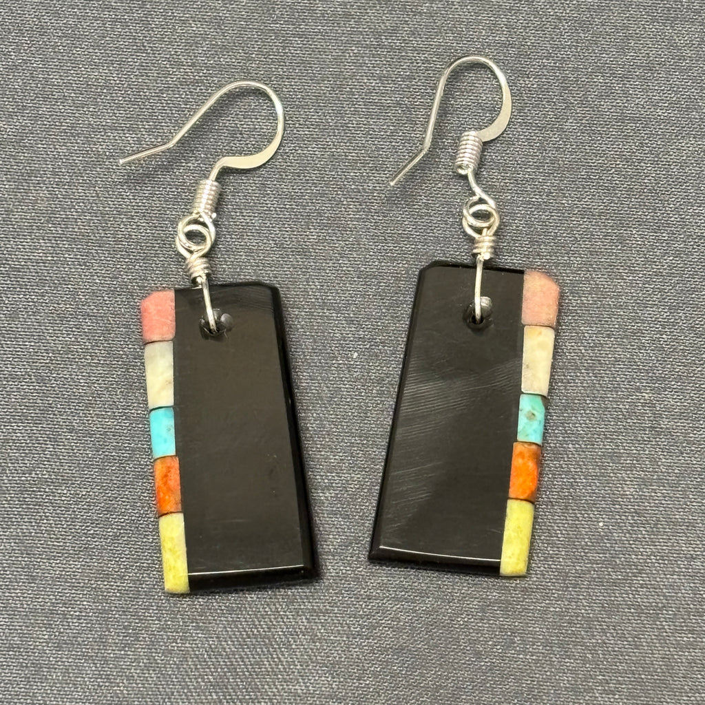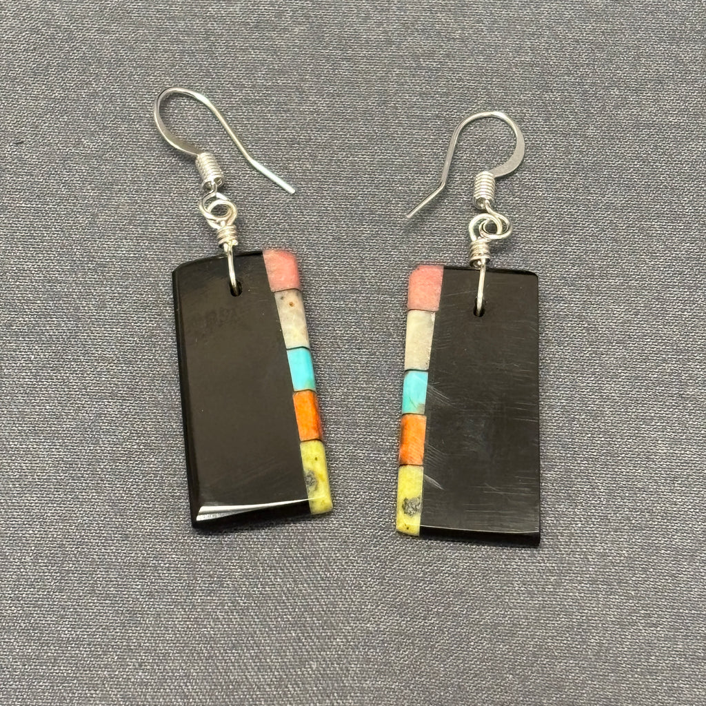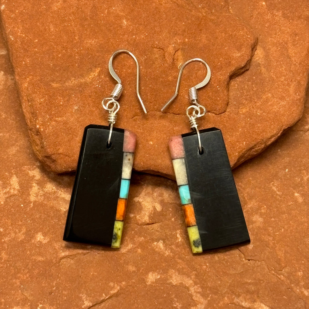 Cute and colorful pair of multi-stone mosaic dangle earrings from Mary Louise Tafoya, Kewa Pueblo (Santo Domingo) featuring black jet and various other stones. Made in Mary's signature style, these dangle earrings on hooks are beautiful and lightweight.