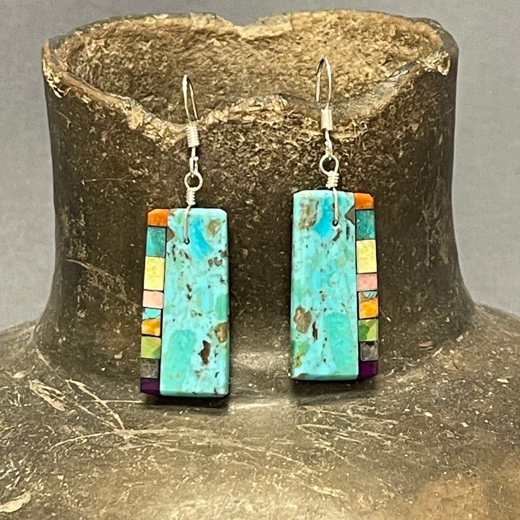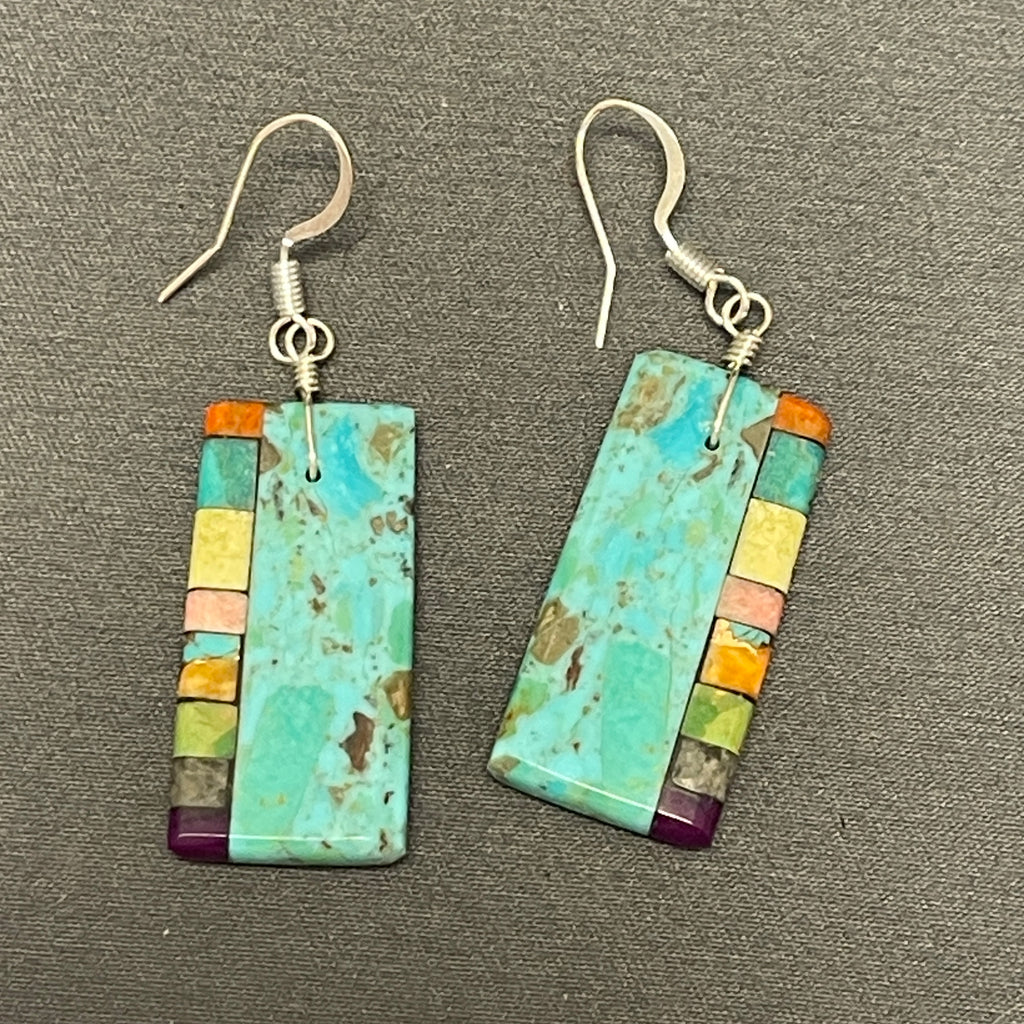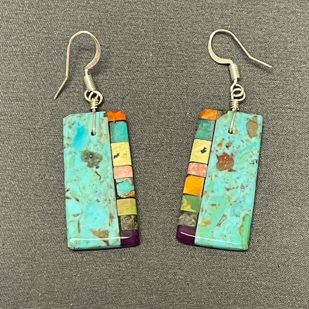 Cute and colorful pair of multi-stone mosaic dangle earrings from Mary Louise Tafoya, Kewa Pueblo (Santo Domingo) featuring turquoise and various other stones. Made in Mary's signature style, these dangle earrings on hooks are beautiful and lightweight.