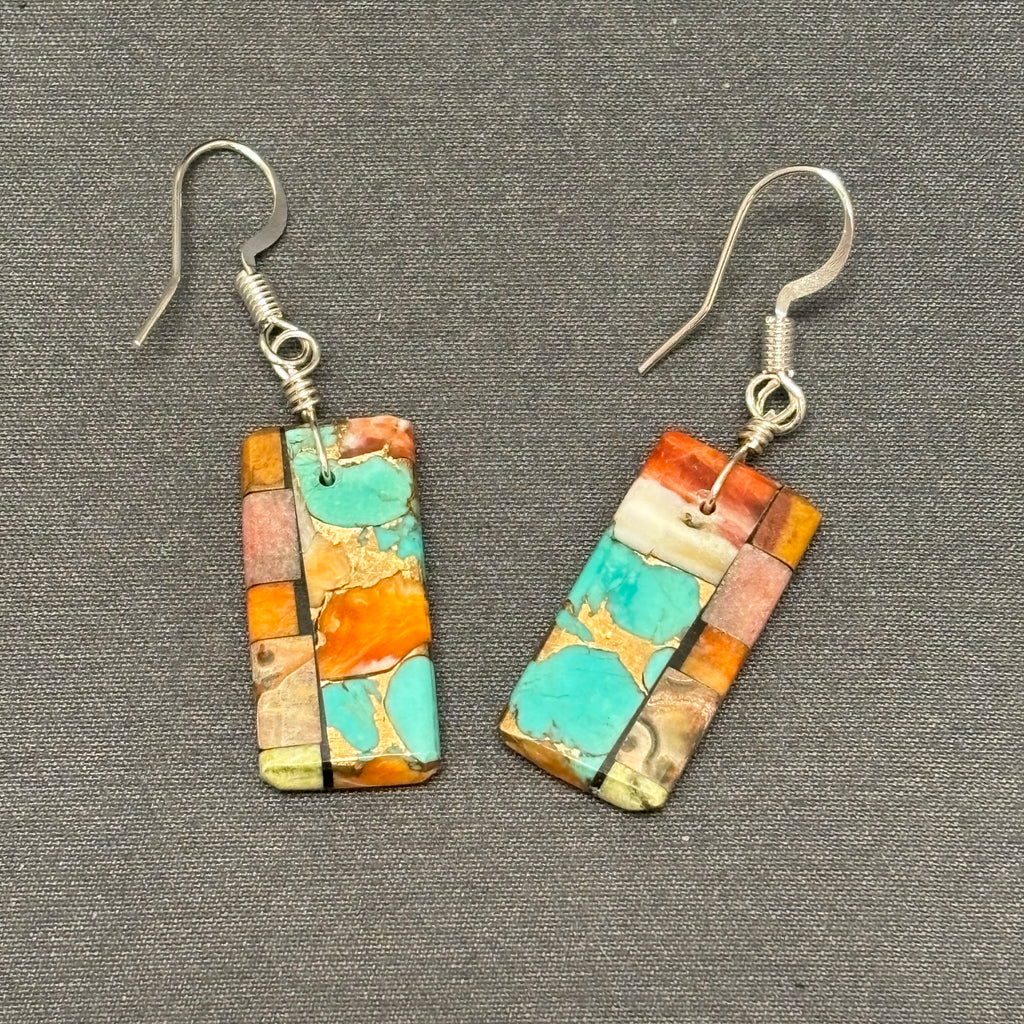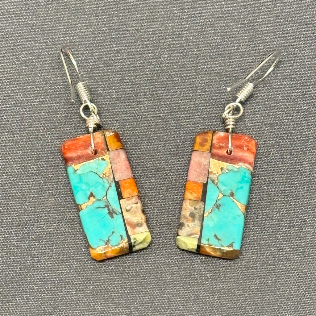 Beautiful pair of multi-stone mosaic dangle earrings from Mary Louise Tafoya, Kewa Pueblo (Santo Domingo) featuring turquoise and various other stones. Made in Mary's signature style, these dangle earrings on hooks are colorful and lightweight.