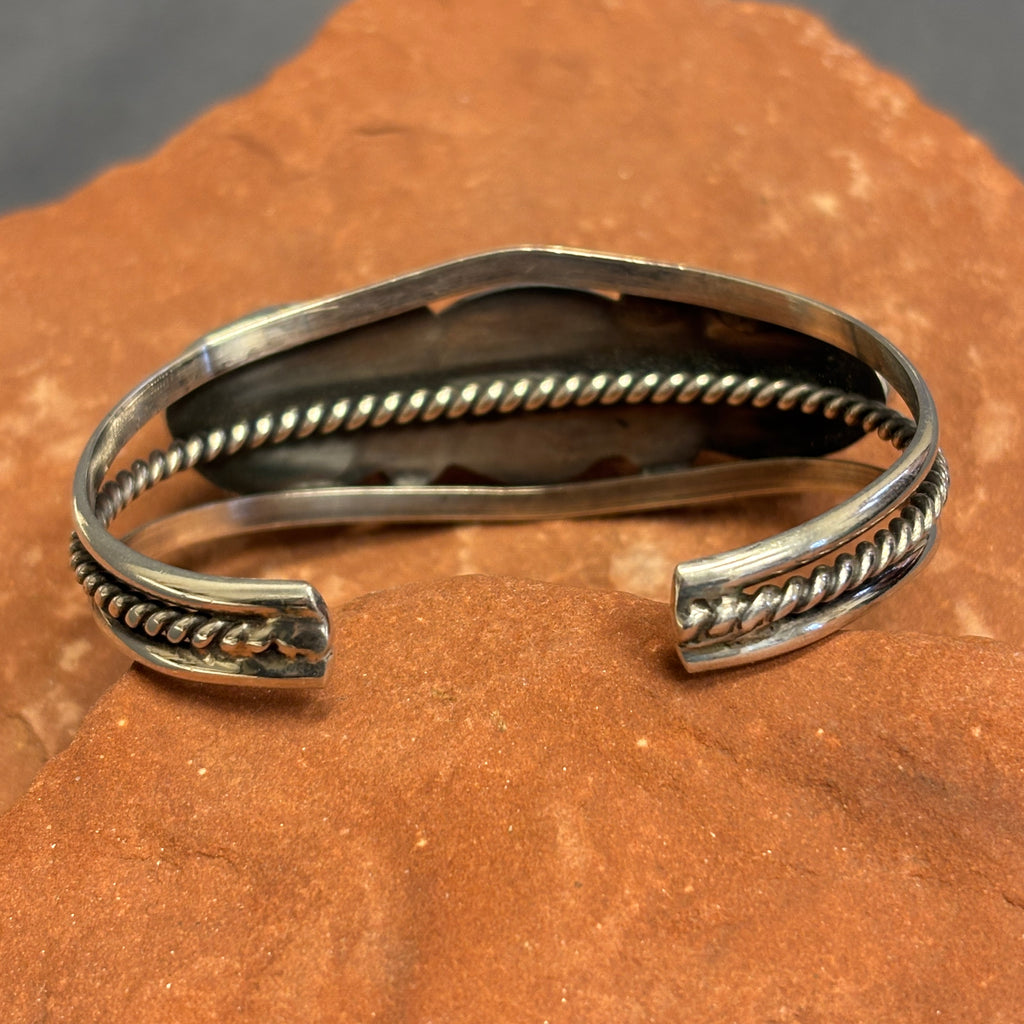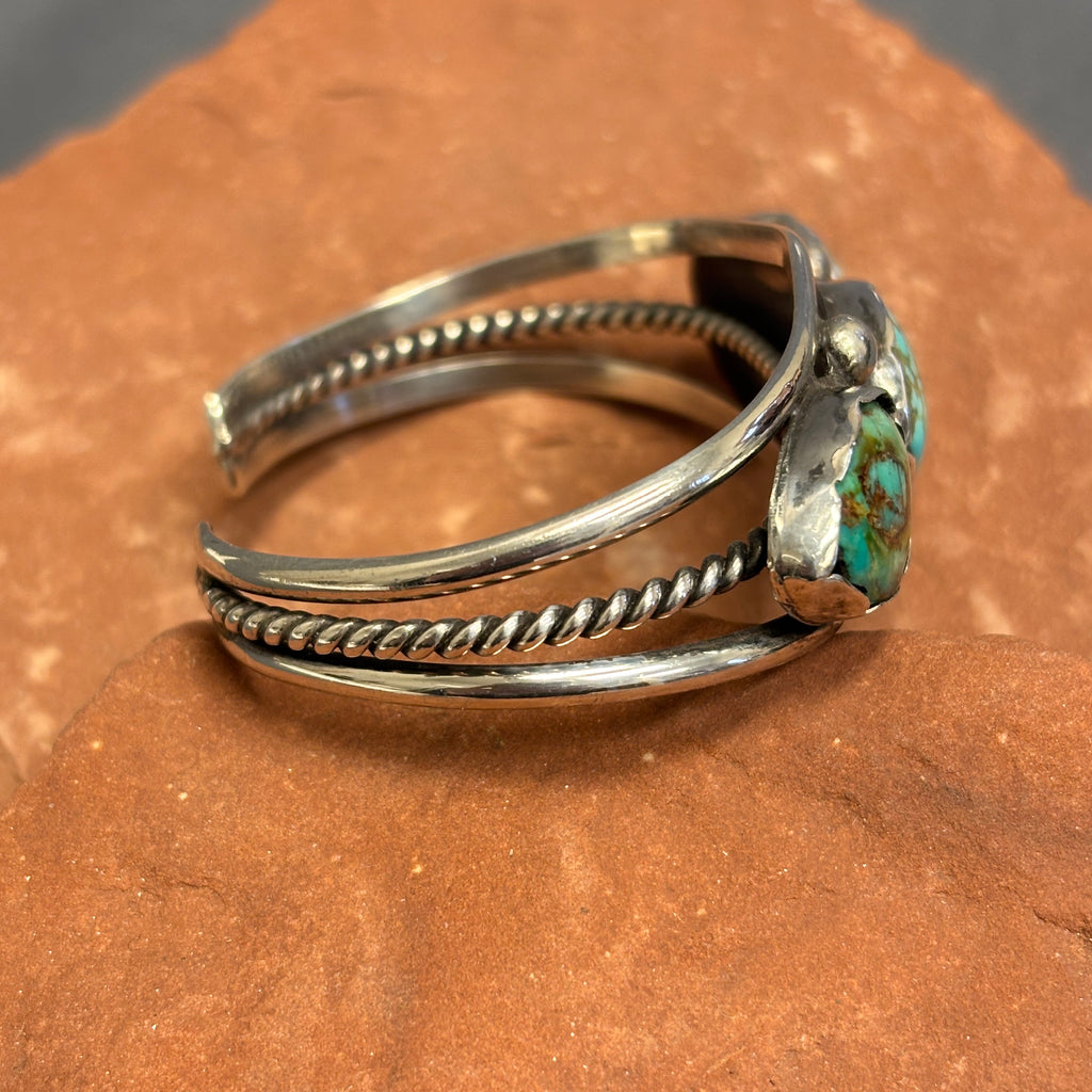 Classic sterling silver Navajo cuff with three beautiful blue turquoise stones set in handmade bezels. The split-shank cuff has a silver twist rope center. This vintage piece is unsigned. A nice addition to any collection!