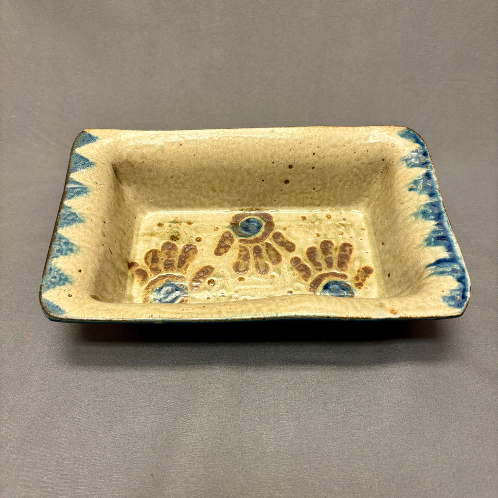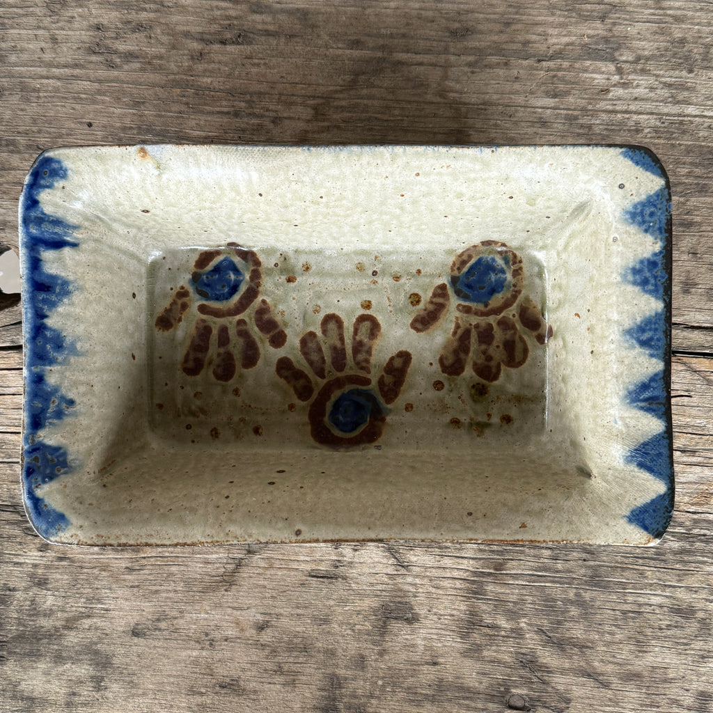 Roomy, pottery loaf pan with Healing Hands design by noted Cherokee artist Mel Cornshucker. Microwave, dishwasher, and oven-safe.