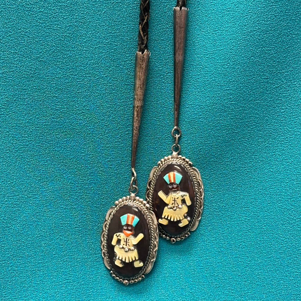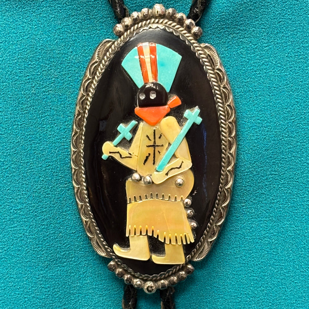 Beverly Etsate Zuni Inlay Apache Dancer Bolo Tie with Matching Inlaid Tips, vintage Native American (JF81)