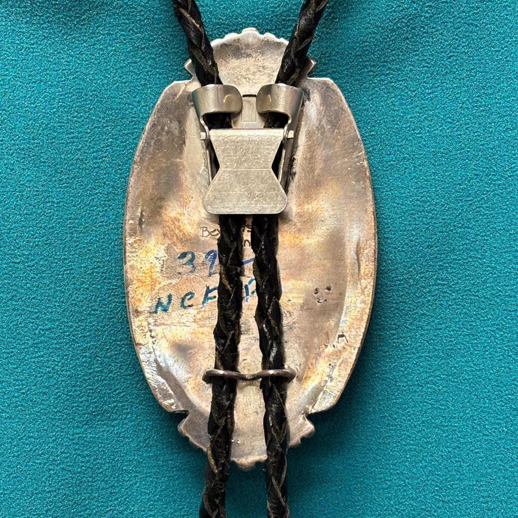 Beverly Etsate created this amazing Zuni Inlay Apache Dancer Bolo Tie.  Crafted in a Victorian cameo style, the large, oval onyx cabochon is set in an ornately stamped sterling silver bezel and frame.  The raised Apache Dancer figure is created with shell, turquoise, red coral and black jet with silver droplet embellishments.  The matching cameo tips have a similar Apache Dancer design.  Strung on a handwoven black leather cord. Etched with the signature "Bev. Etsate Zuni" on the back of the slide and the tips.  Just beautiful!