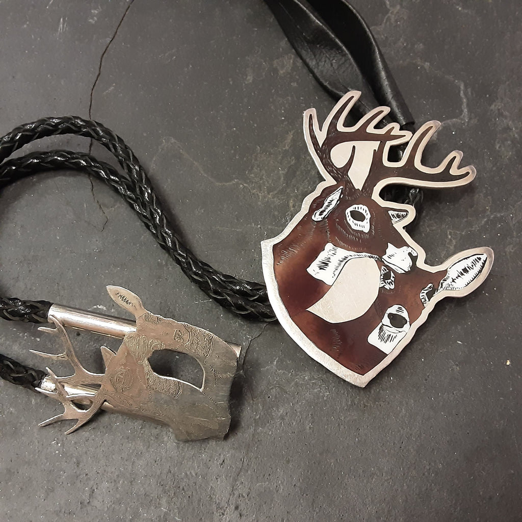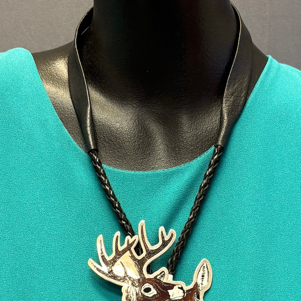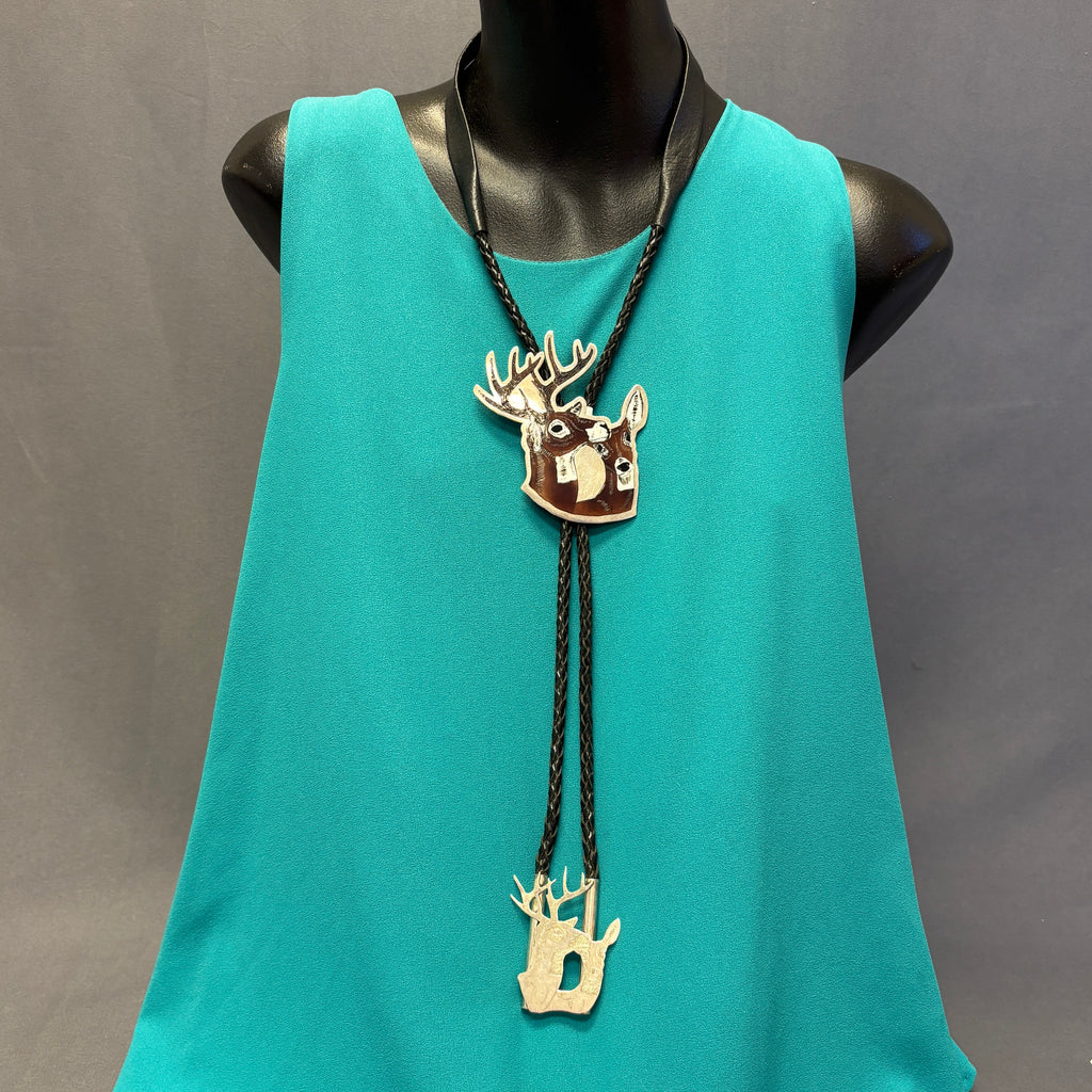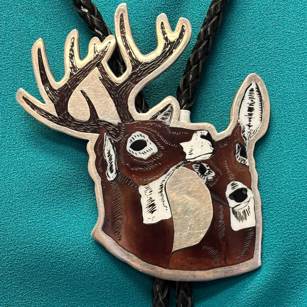 Dale Edaakie, Shell Zuni Inlay Bolo Tie w/ Buck and Doe Design, vintage Native American (JF72)