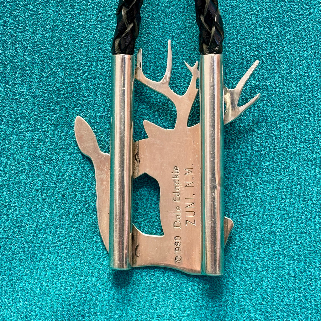 Gorgeous sterling silver Zuni inlay bolo tie with etched buck and doe design by Dale Edaakie. This flush-inlay piece features incredibly lifelike details etched into pin or pen shell, clam shell and black jet. Strap is a flat leather piece at the neckline attached to woven black leather straps. Plain sterling silver tips are held together with an etched silver piece that is a duplicate of the slide design. Both the slide and tip are stamped with Dale's hallmark and the date of 1980.