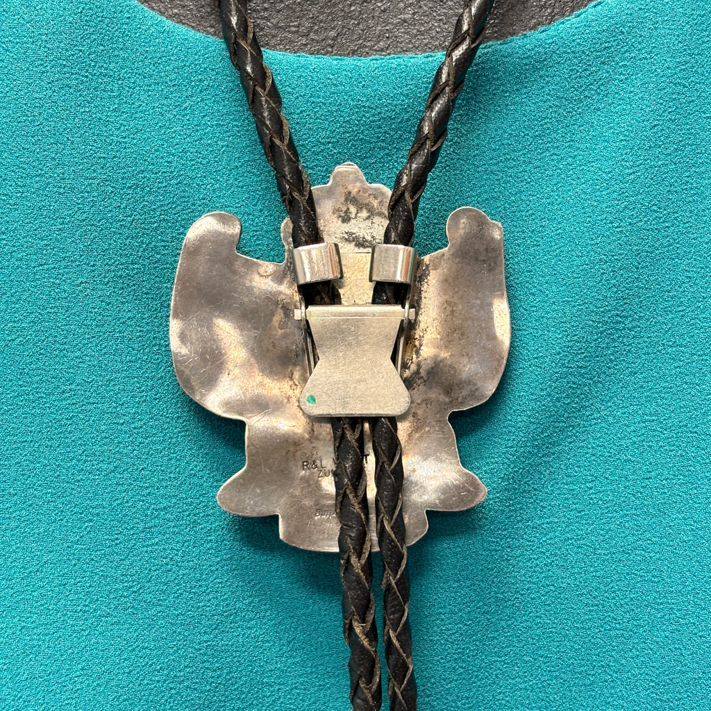 This authentic Zuni flush inlay bolo tie features a beautiful Celebration Man design set on a stamped sterling silver base. Stones include turquoise, mother of pearl, black jet and red coral. The black braided strap has coordinating stamped sterling silver tips with an inlaid geometric design. The slide is signed "R & L Vacit" by Zuni artists Ricky and Lucy Vacit.