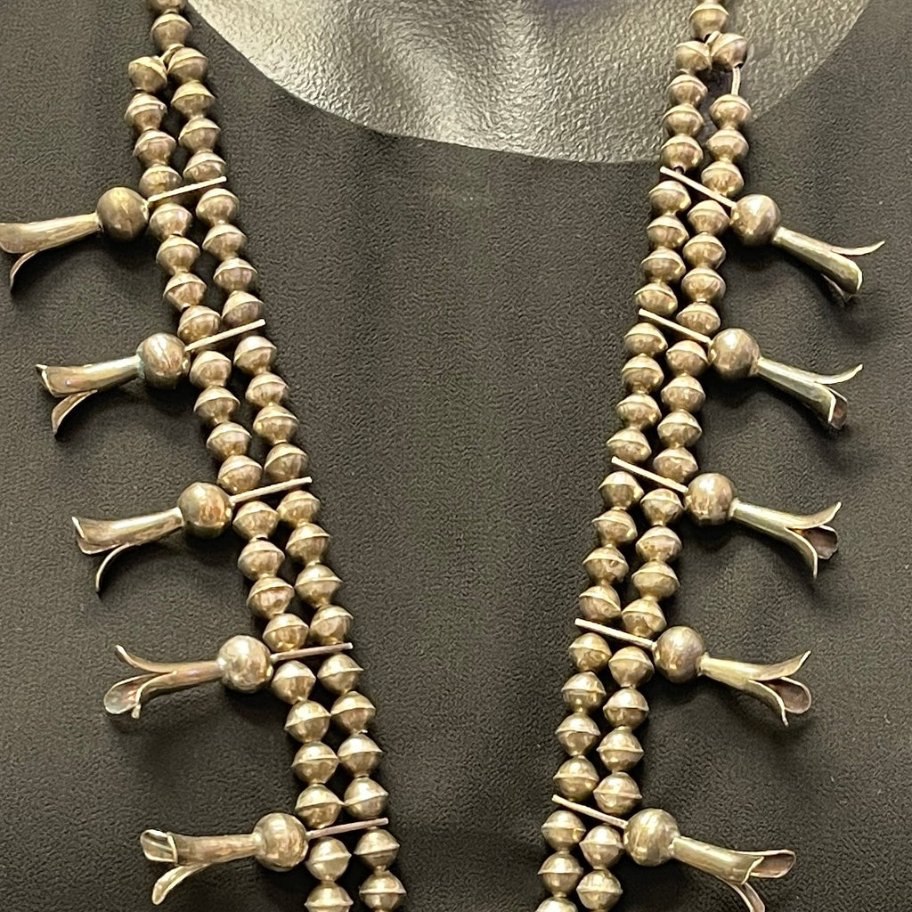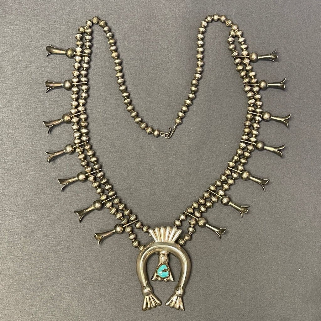 Vintage Silver Navajo Squash Blossom Necklace with Turquoise + handmade beads (5/260)