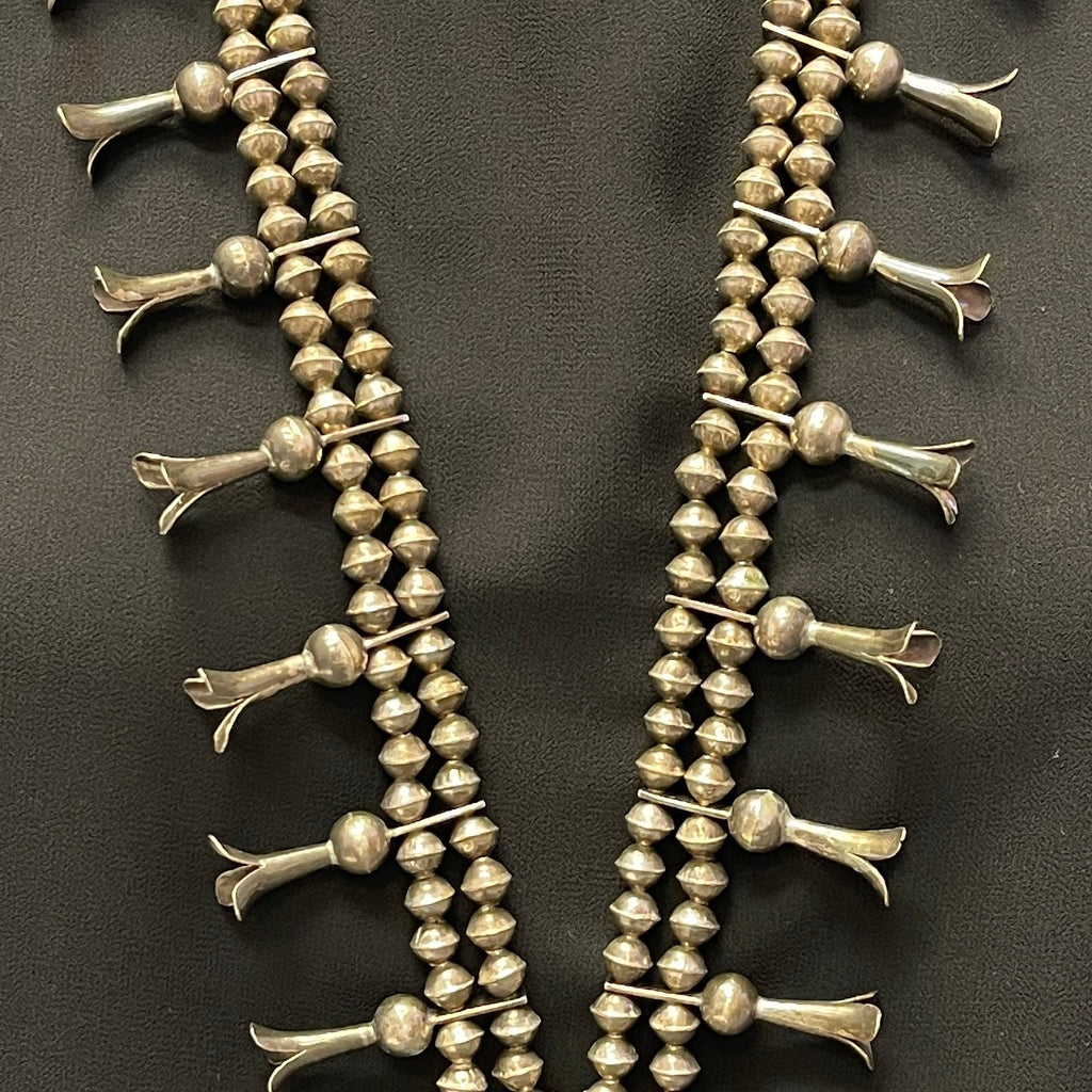 This simple and elegant squash blossom necklace is all silver, with one beautiful blue piece of turquoise set in the naja. The 12 beaded blossoms are strung on a double strand of handmade silver beads, with a single strand of beads running up the neck. The silver naja is a fluted, sandcast design. Hook closure. So beautiful!