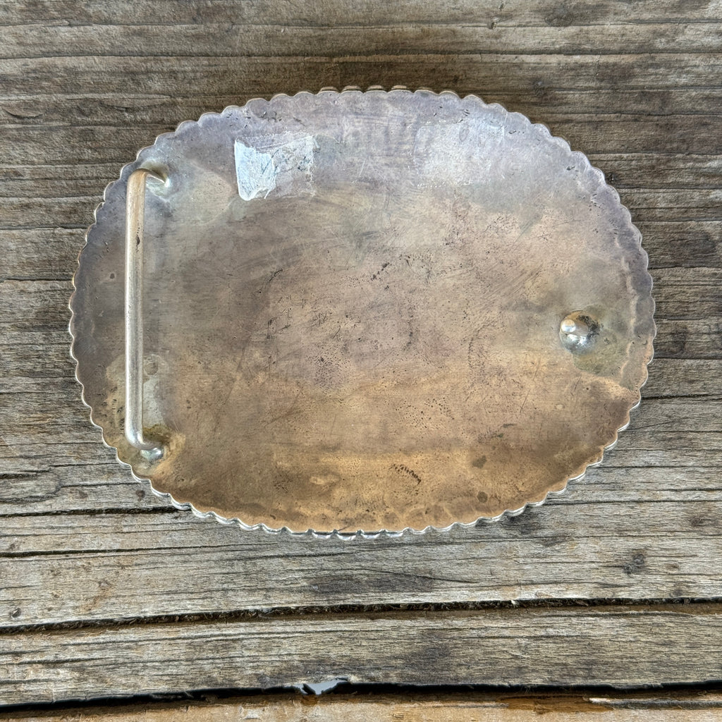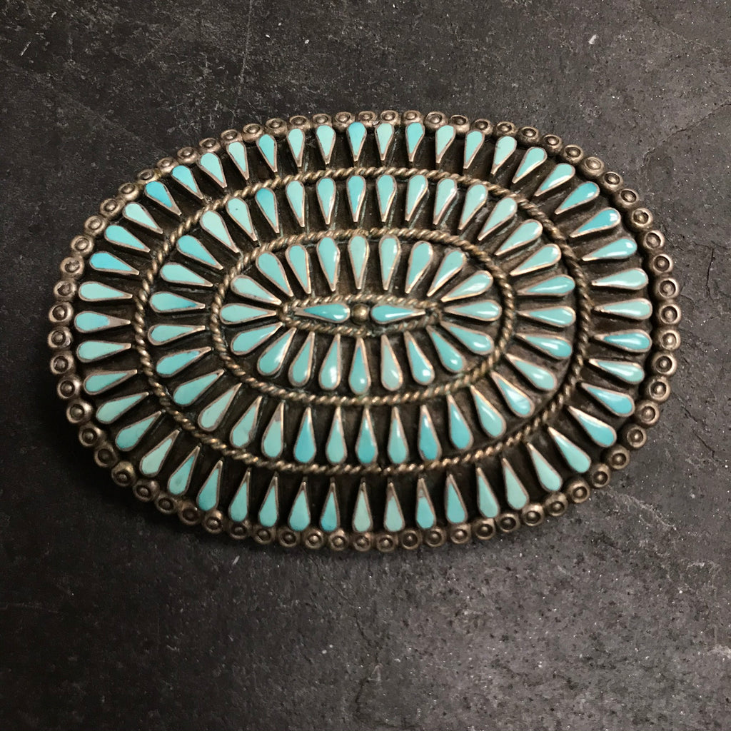 This stunning authentic Zuni sterling silver oval belt buckle is inlaid with an array of teardrop-shaped turquoise stones, each set in a flat bezel.
