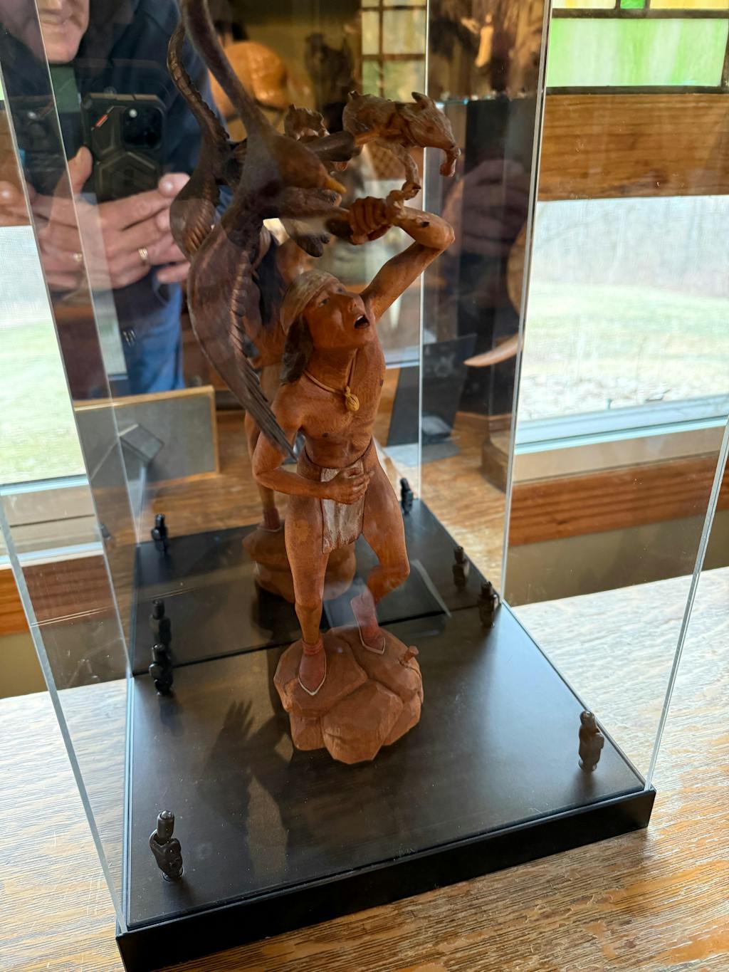 Wow! There are very few carvers who can capture the movement and detail of a figure like Raymond Chee. In this carving, called "Success!," a young hunter has captured a hawk by using a rabbit as bait. The lifelike detail is just outstanding.